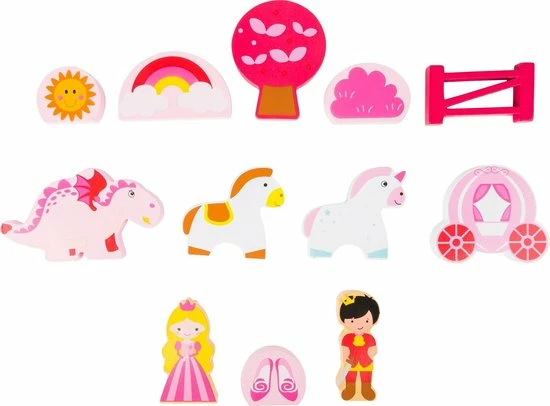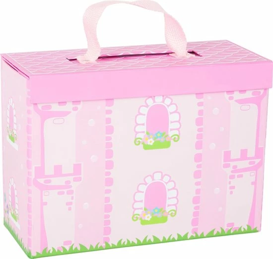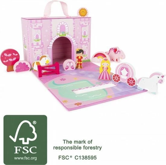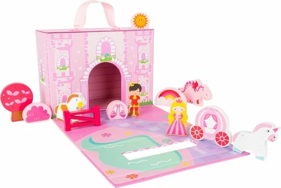 Een heel kasteel in ??n doos! Open het eenvoudig en de prins zal zijn prinses kunnen redden. Een eenhoorn en een paard met een magische koets zitten ook in deze set en maken dit stevige kartonnen kasteel compleet. Het is veilig afsluitbaar en wordt geleverd met een handvat, zodat je het kasteel makkelijk overal mee naar toe kan nemen. Alle speelfiguren zijn gemaakt van hout. Betoverend speelplezier voor onderweg.